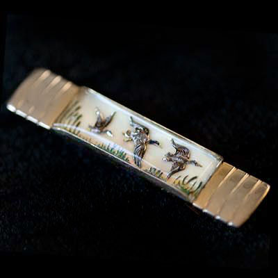 A beautifully crafted vintage tie clip depicting three Canada geese flying over a reed bed. The background visible behind the rounded glass is mother-of-pearl, and the birds and plants are painted on silver-colored metal reliefs.