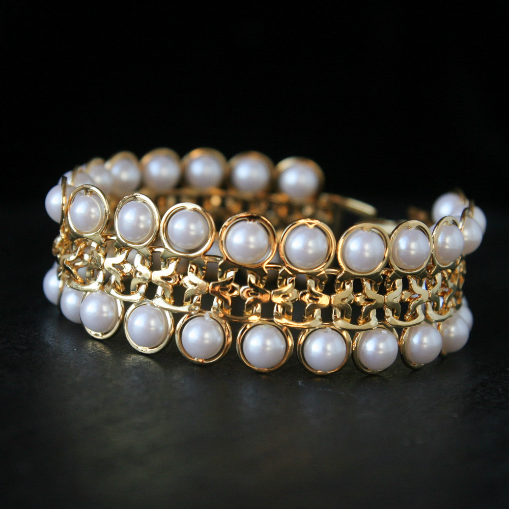 A lovely vintage bracelet with a combination of double strands of pearls and glossy and beautiful gold. This Avon product has a very supple and gentle curve and can be worn with a light feel like a fabric accessory.