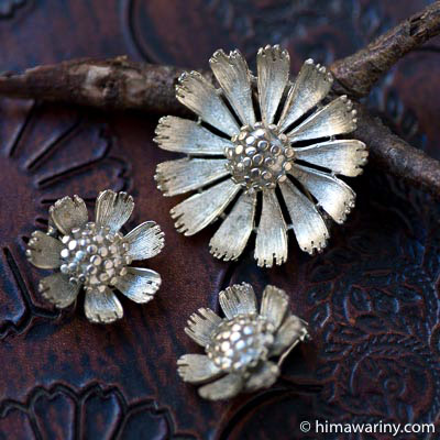 A vintage brooch and earrings jewelry set with a motif of pretty daisies or gerberas.