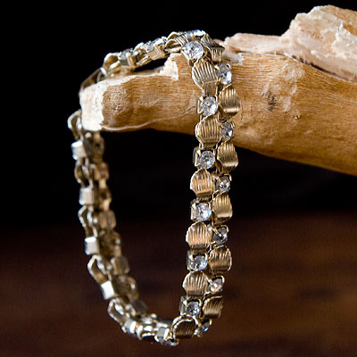 Vintage bracelet with engraved shell alternating with prong-set rhinestones. It shines elegantly with just the right amount of volume.