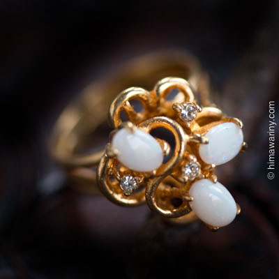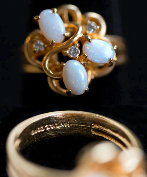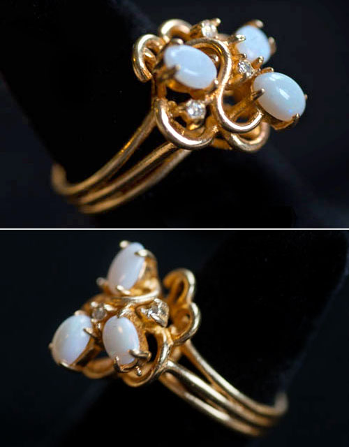 A vintage ring with a tall three-dimensional design, featuring opals prong-set like a three-step staircase, with diamond-like rhinestones in between.