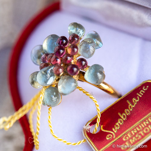 Unused dead stock from the collection of Nate Waxman, the founder and designer of Swaboda. Swoboda’s rings are not engraved, but have a tag with the logo and text “Swoboda Inc. GENUIN GEMSTONES.” Comes in a cute heart-shaped jewelry box. This is also from Swaboda’s selection.