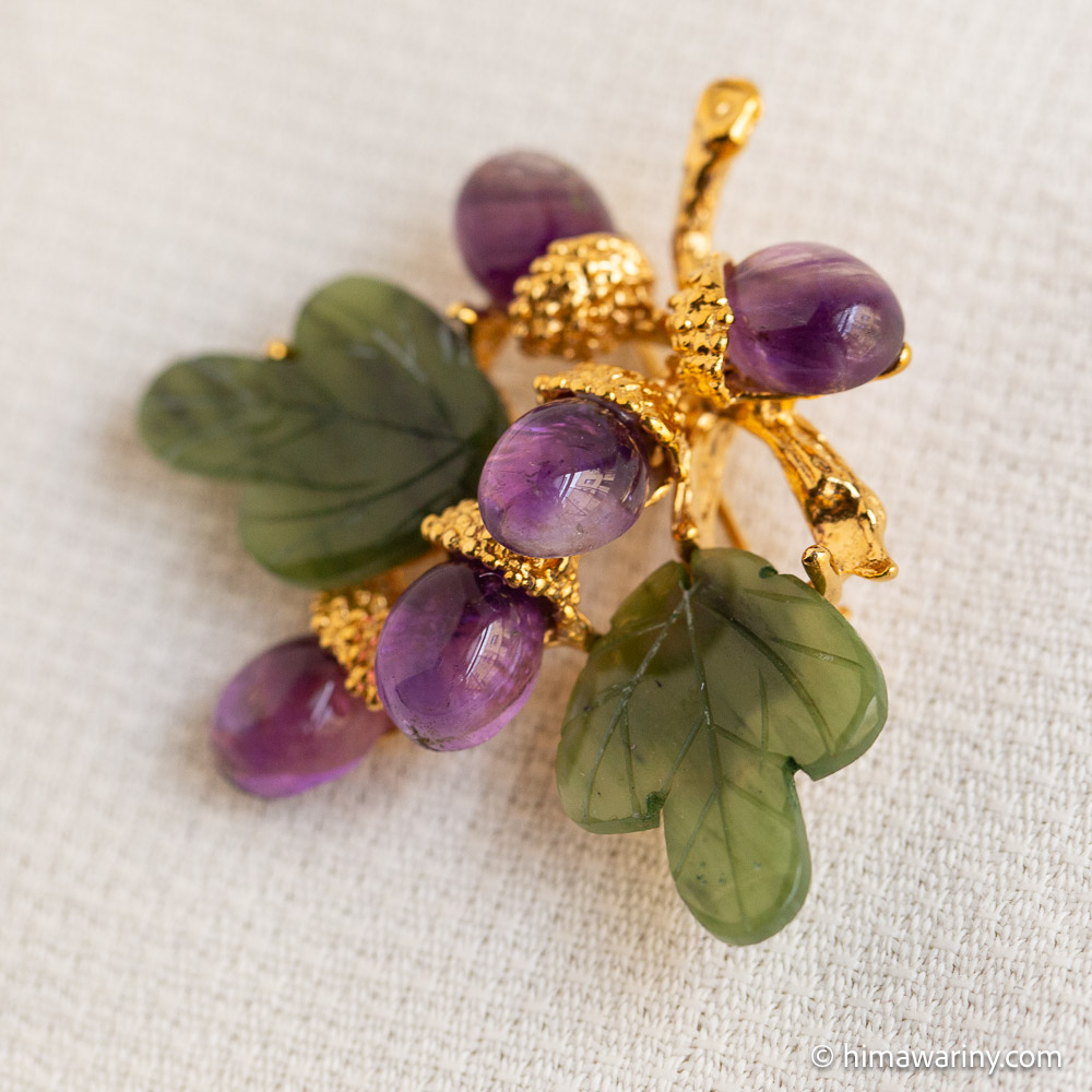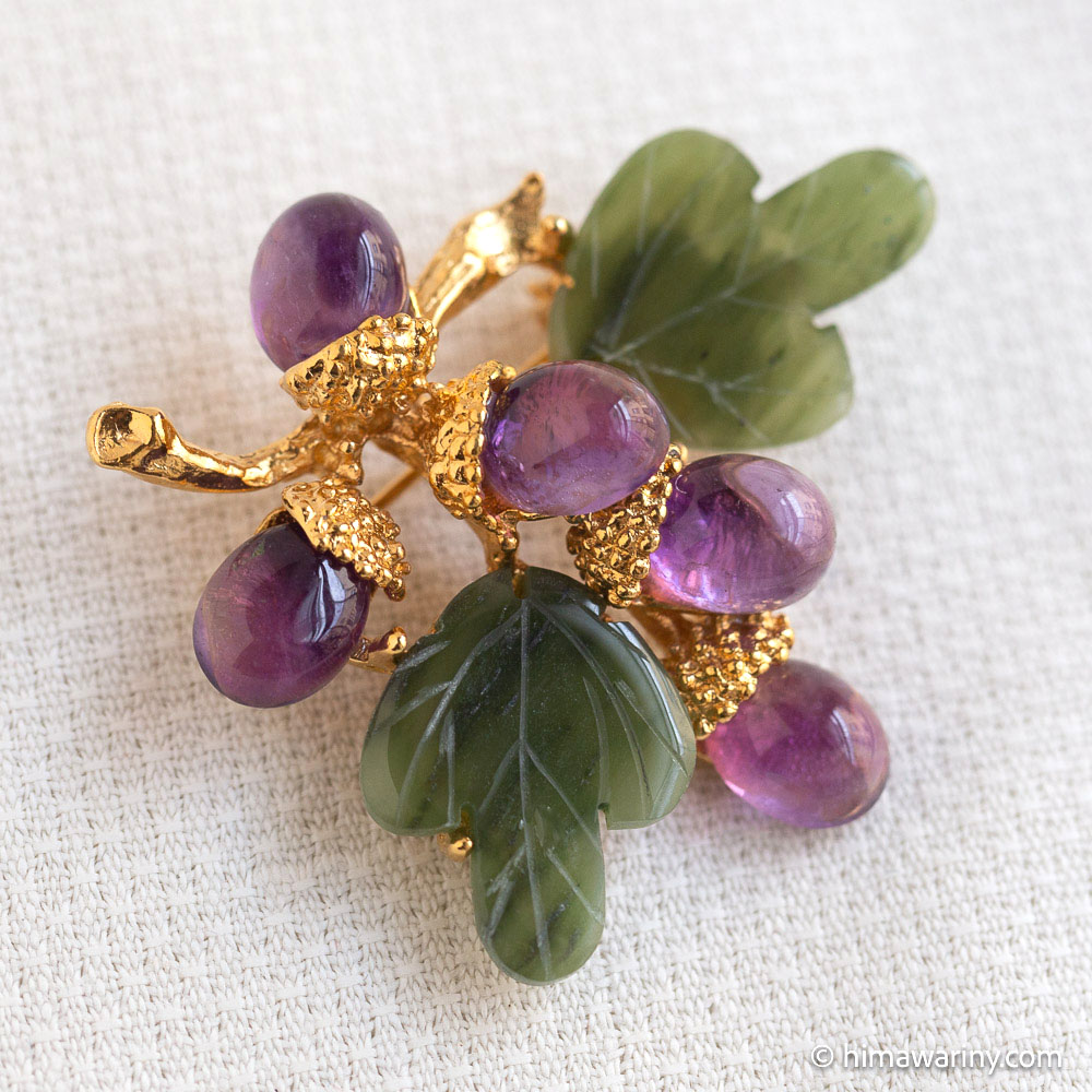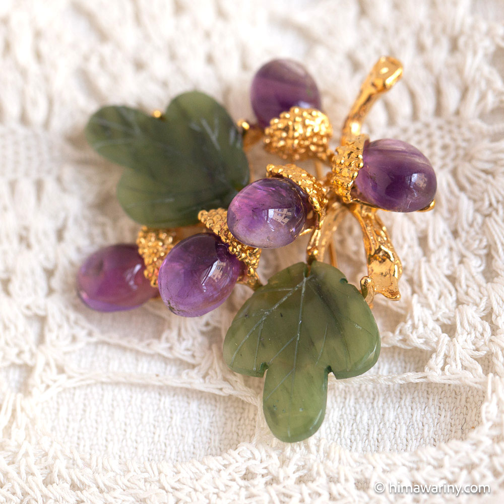 A vintage brooch with jade leaves with hand-engraved veins, a beautiful natural stone with a fresh and fruity purple shade, and amethyst cabochon acorns.