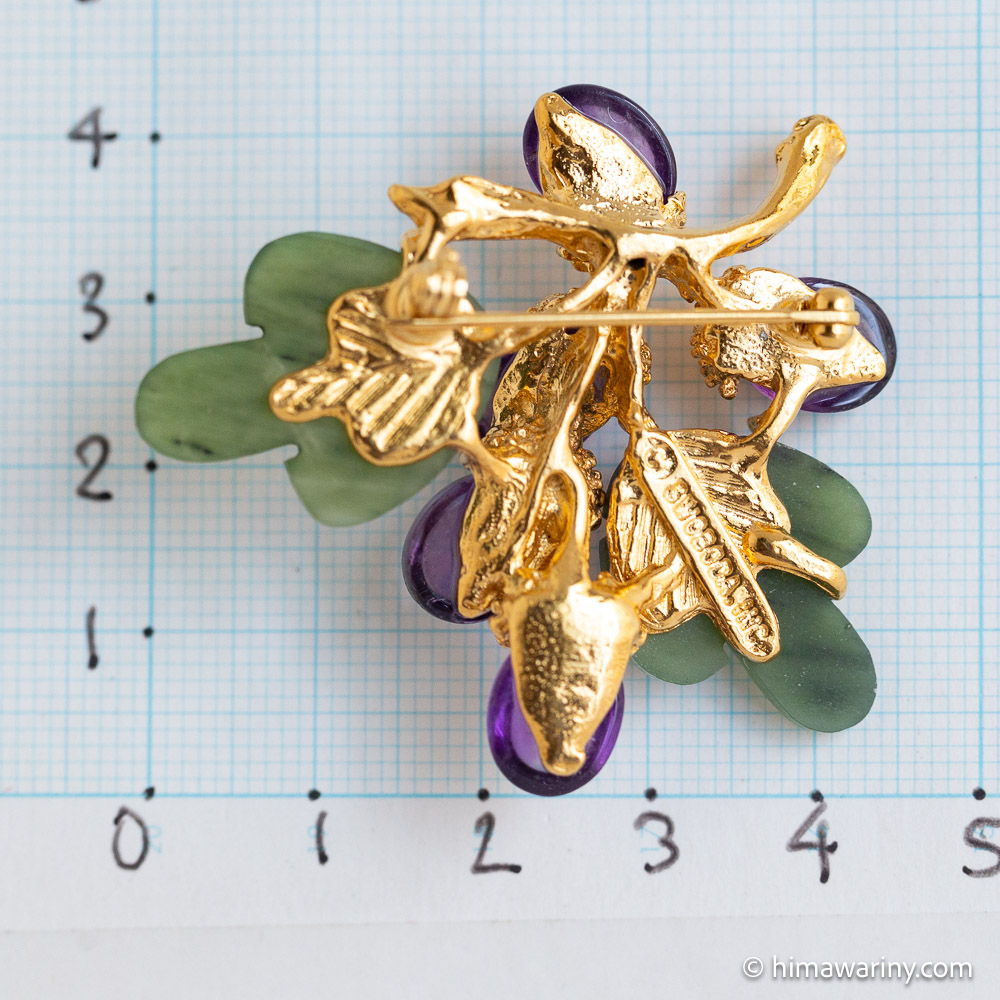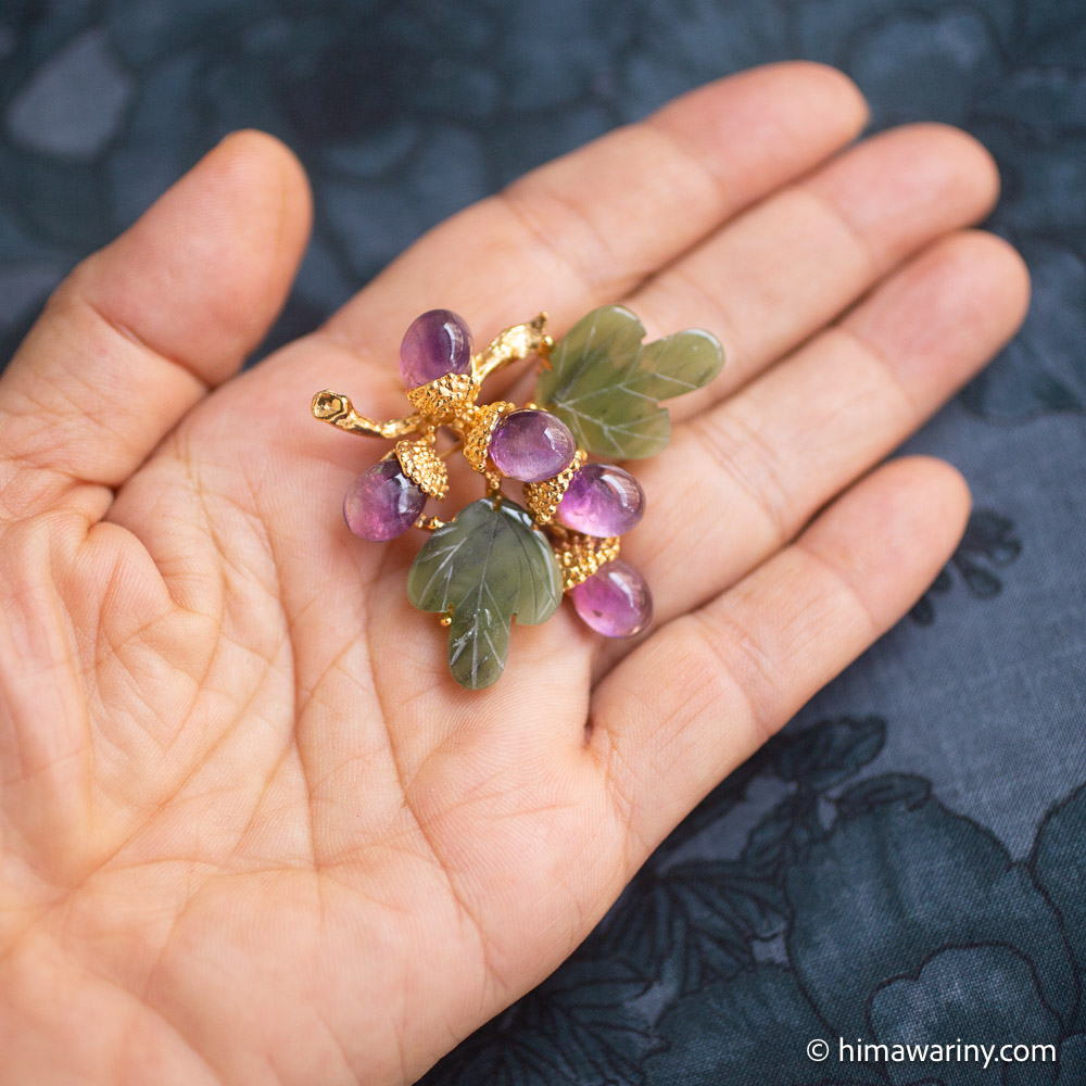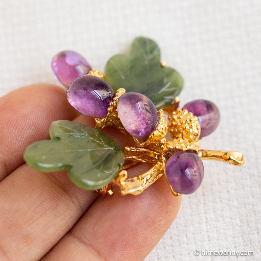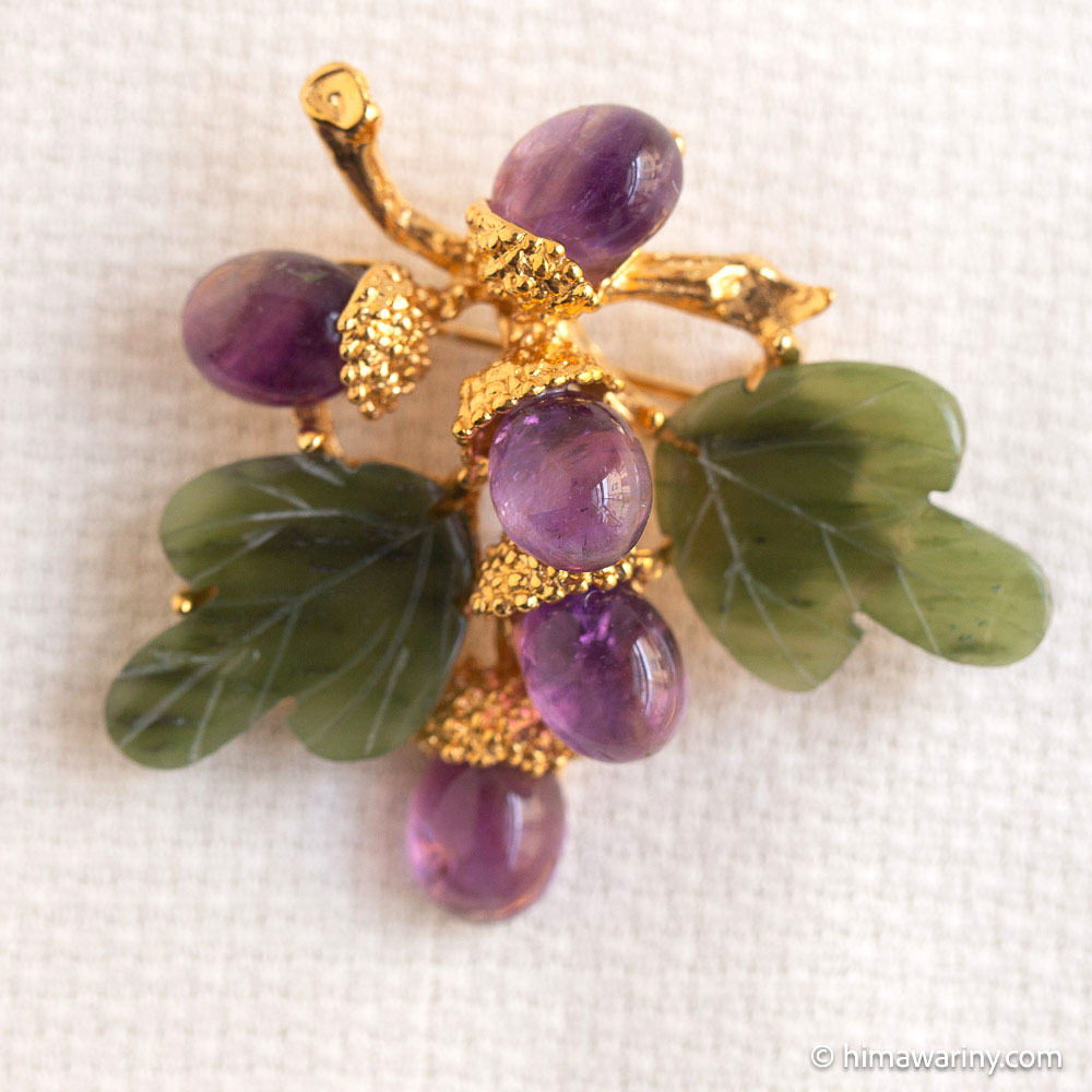 A vintage brooch with jade leaves with hand-engraved veins, a beautiful natural stone with a fresh and fruity purple shade, and amethyst cabochon acorns.