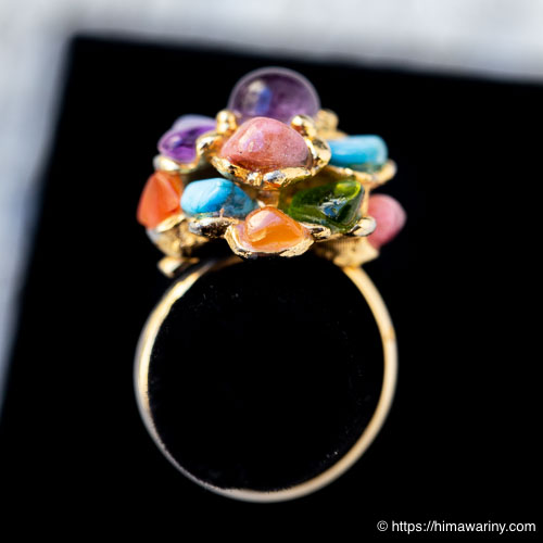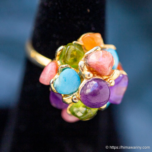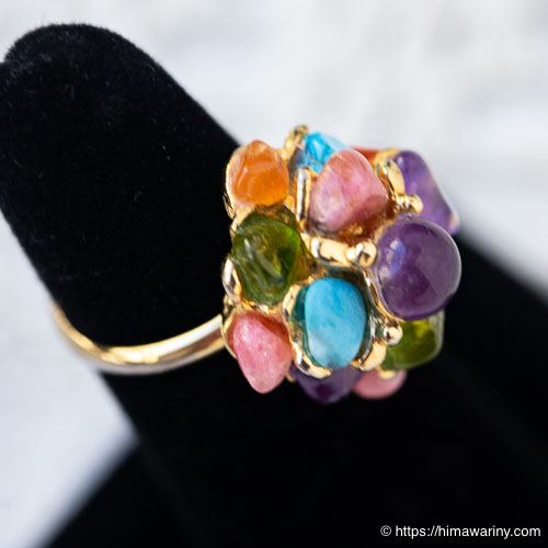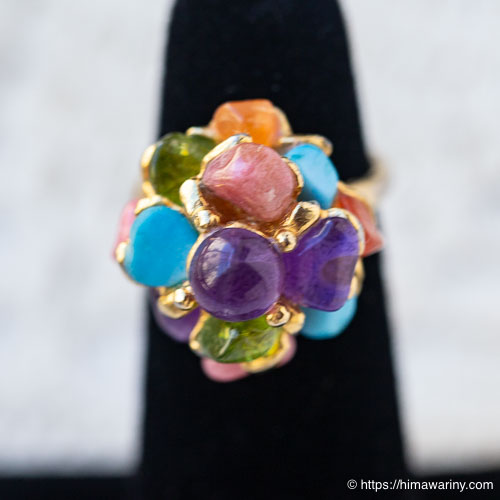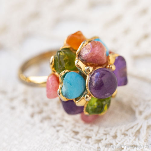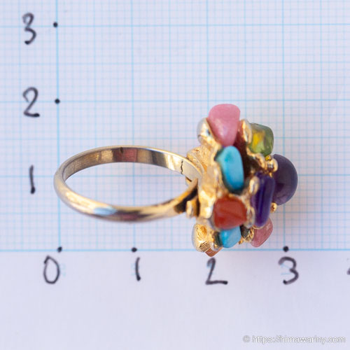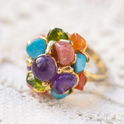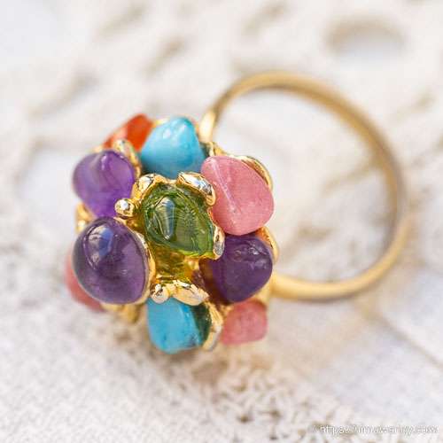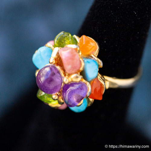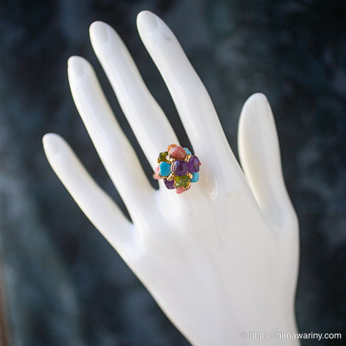 A very artistic and unique vintage ring with a dynamic three-dimensional arrangement of purple amethyst, lime green peridot, orange carnelian, pink rhodonite, and turquoise blue turquoise. .