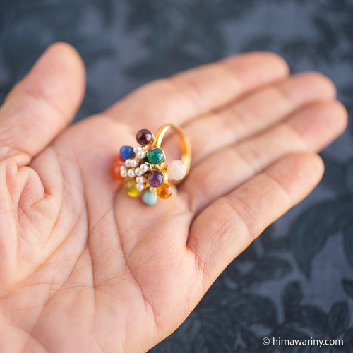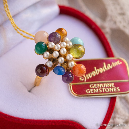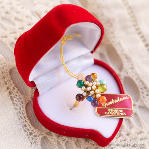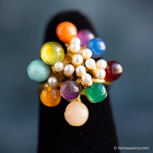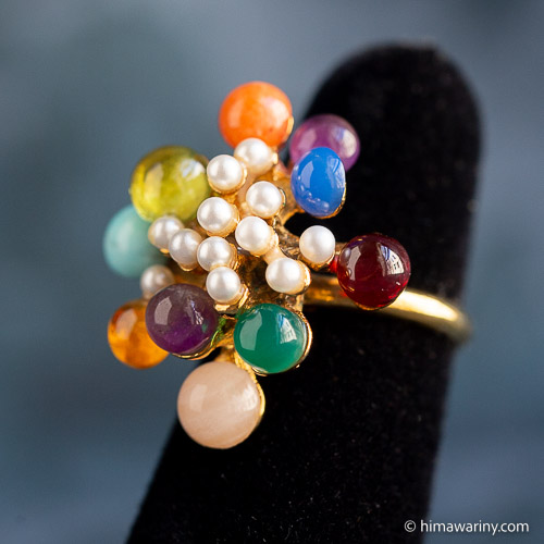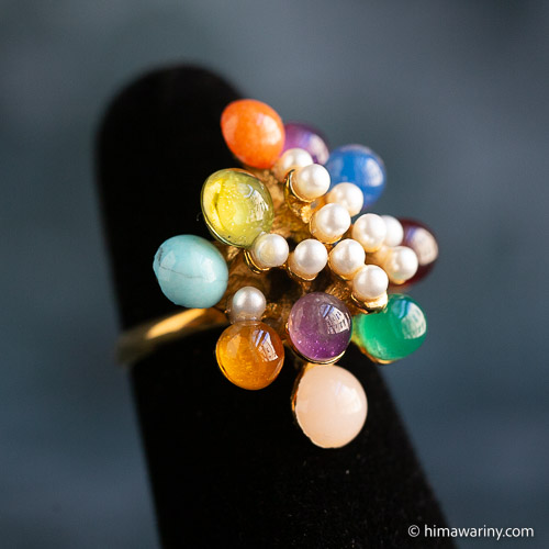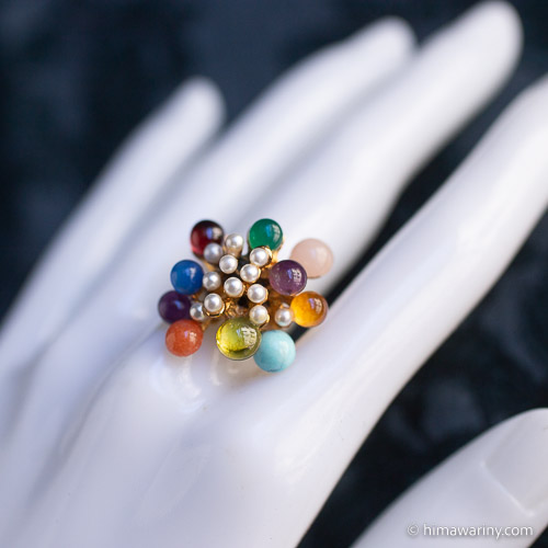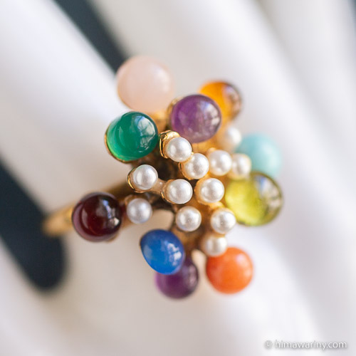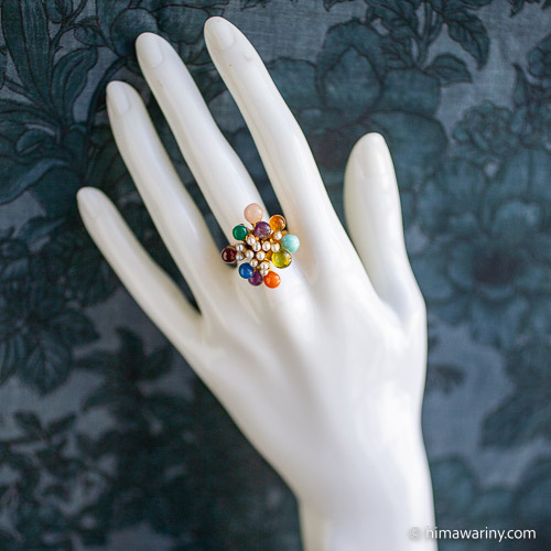 An artistic and unique vintage ring with colorful jewel drops and small pearls arranged in an organic design.