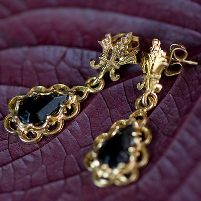 These earrings have teardrop jet black colored rhinestones that mysteriously sway.