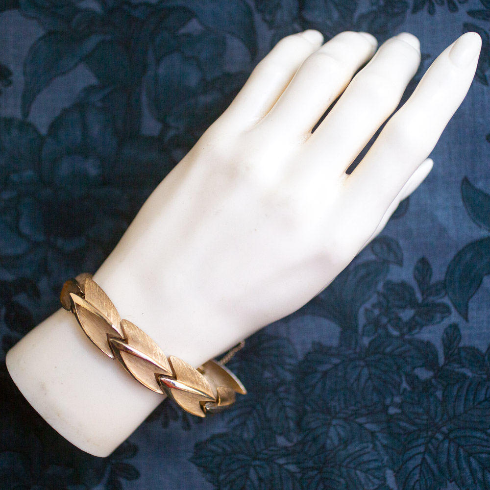 The contrast between the satin-like gold surface texture and the glossy gold adds depth to the elegant design. In terms of vintage, American costume jewelry brand that is very popular among collectors Crown Trifari‘s bracelet.
