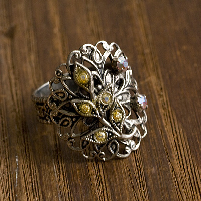 This is a lovely ring with a filigree (lace-like metal line work) design, a leaf pattern on top, and an organic design with plant motifs. I love that there is an ivy leaf pattern on the side of the ring! Made in West Germany.